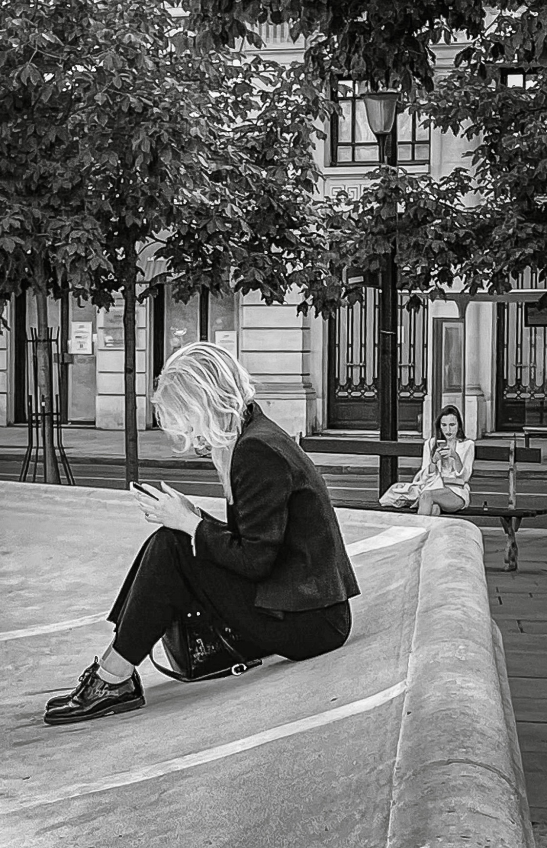 La lettre où l'amour se prend à la lettre. Two young women reading on the smartphone in a square in Paris