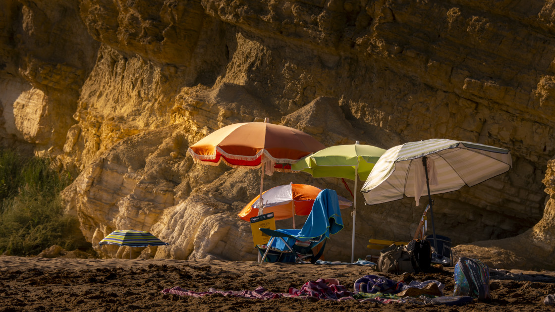 Parasols in front of a cliff